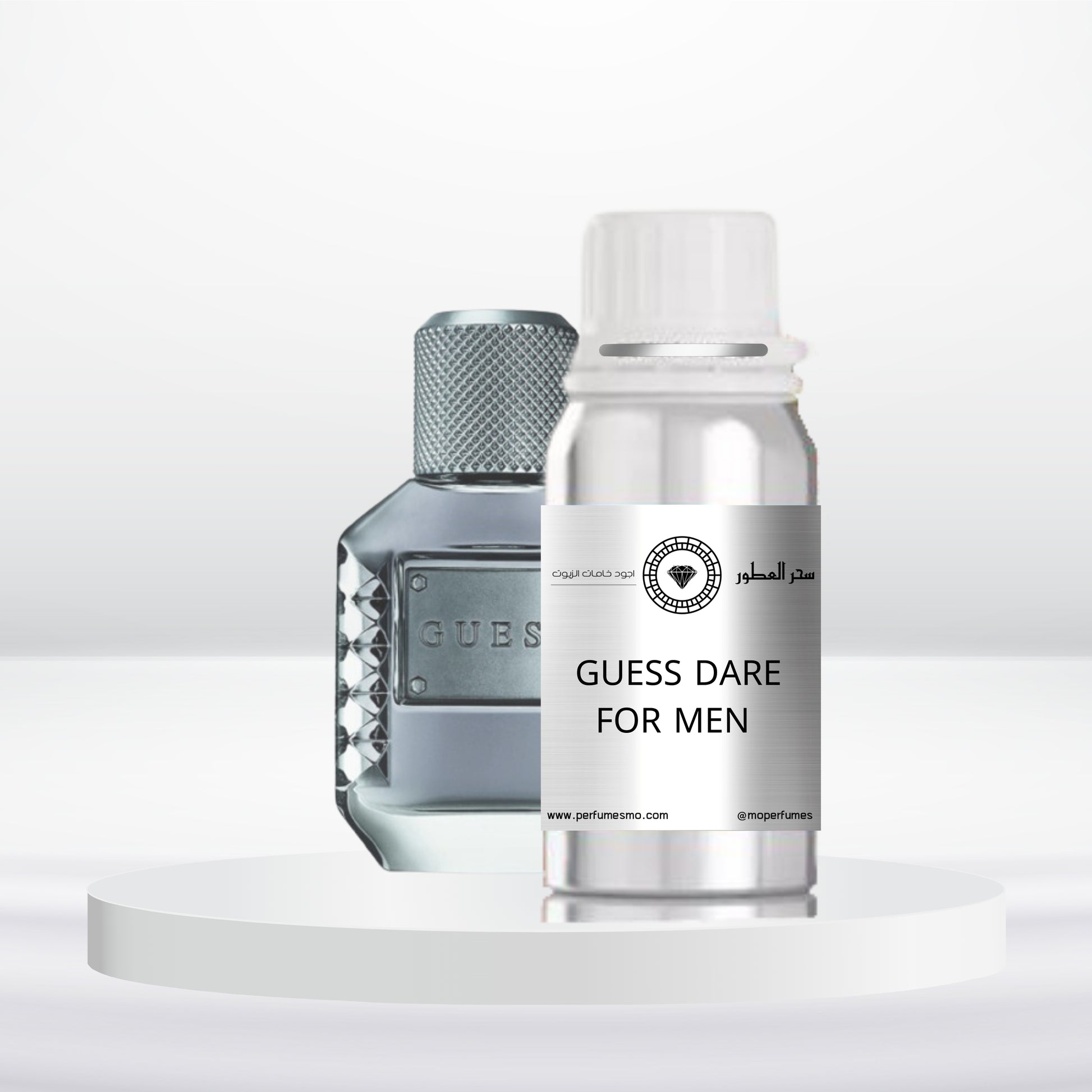 Guess Dare for Men يتميز بنفحات عليا من الفلفل الأبيض، البرغموت، والتفاح الأحمر، يتبعها قلب من خشب الأرز، الكشمير، والجزر البري، وقاعدة من المسك، خشب الباتشولي، وخشب الأرز.