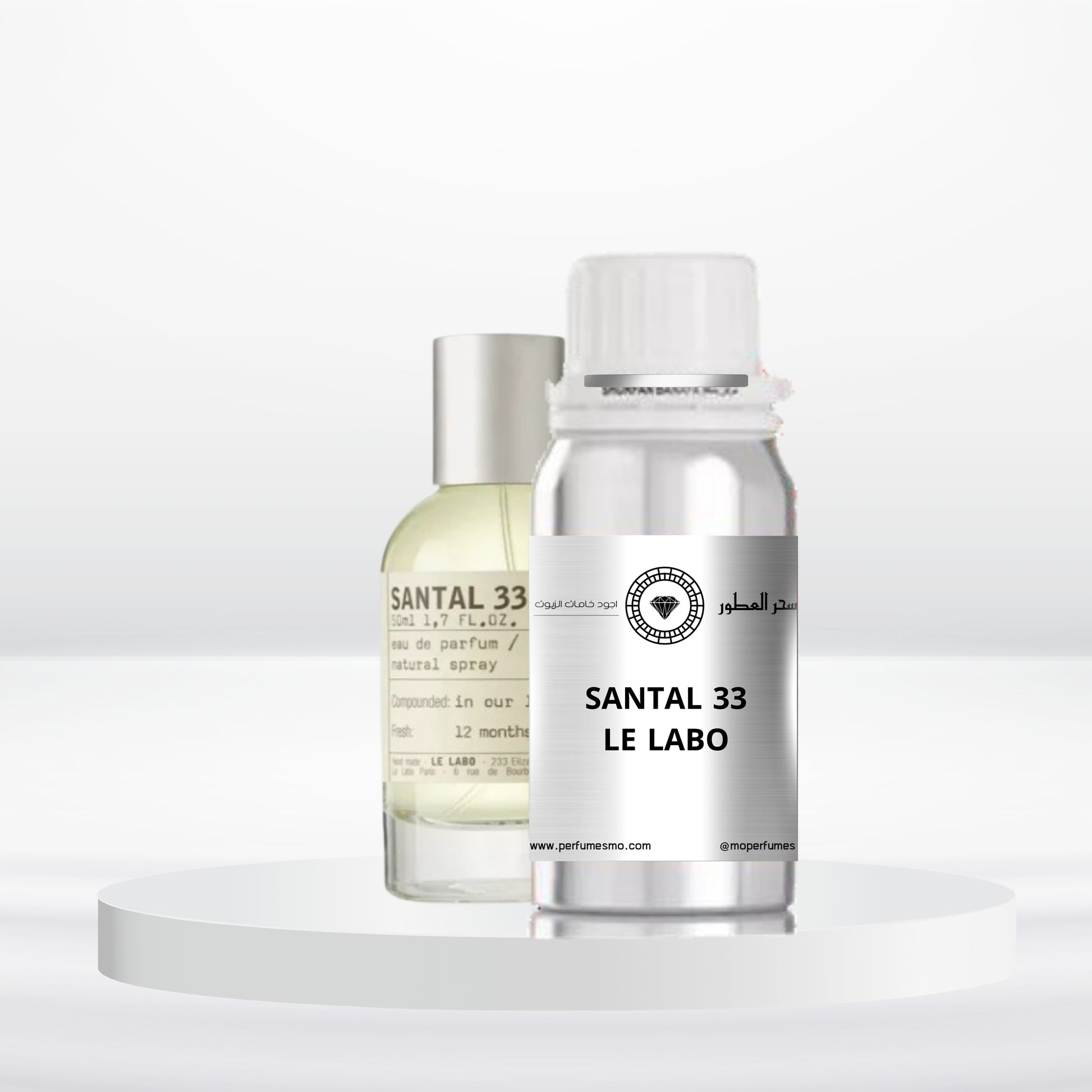 عطر Santal 33 Le Labo يحتوي على مكونات عليا من خشب الصندل، اللافندر، والفلفل الأسود، مع قلب من الأرز، زهرة السوسن، والجلد، وقاعدة من المسك، العنبر، والفانيليا.
