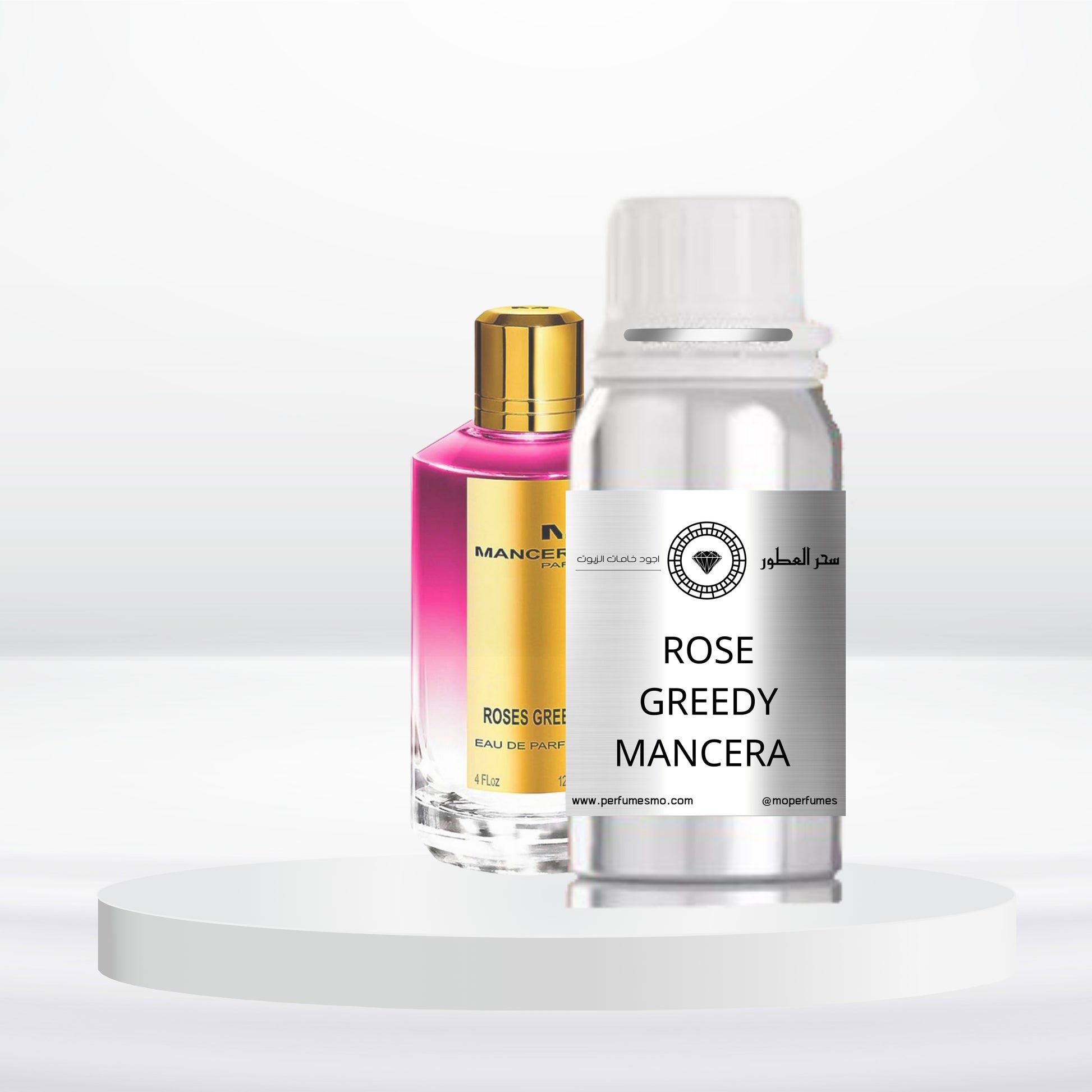 عطر Rose Greedy Mancera يفتتح بمزيج فاكهي من الماندرين، جوز الهند، الخوخ والكشمش الأسود، مع قلب زهري من الورد والياسمين وزنبق الوادي، ويستقر على قاعدة من العنبر، الفانيليا، المسك الأبيض والباتشولي.