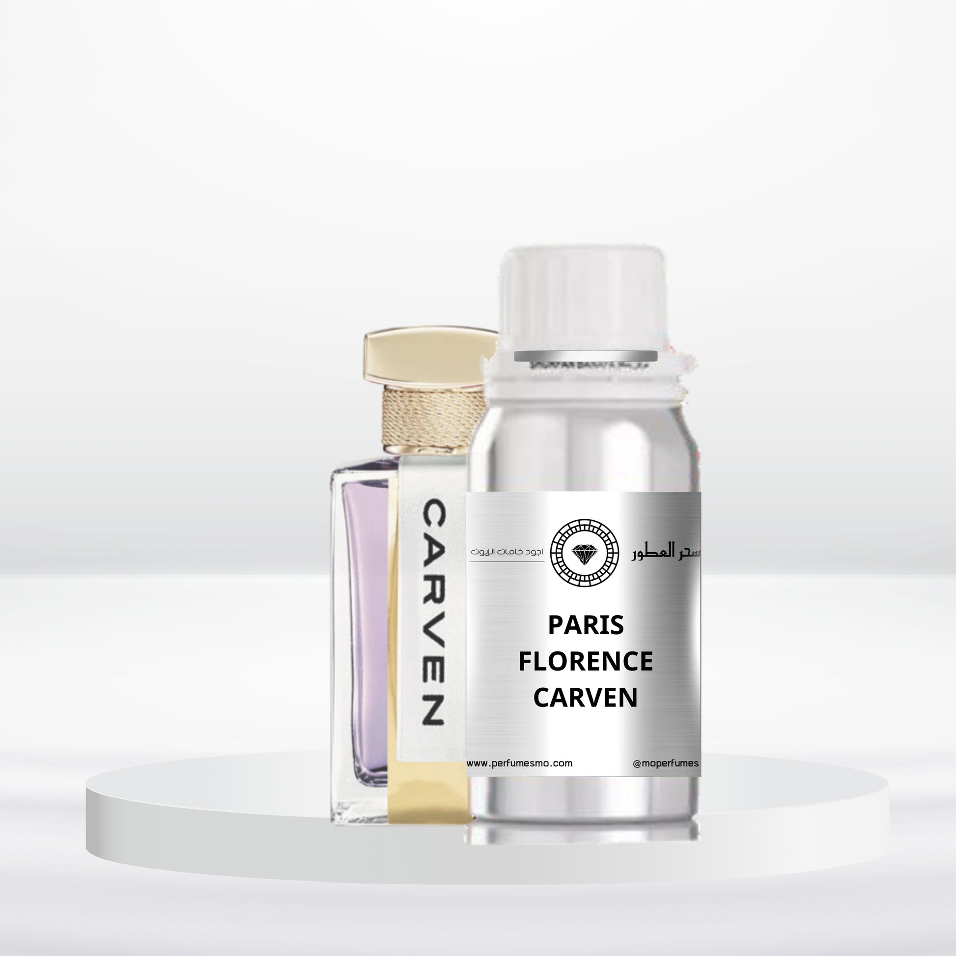 عطر PARIS FLORENCE CARVEN يحتوي على مكونات عليا من الليمون، البرغموت، والبرتقال، مع قلب من الورد، الياسمين، والفل، وقاعدة من خشب الأرز، المسك، والعنبر.